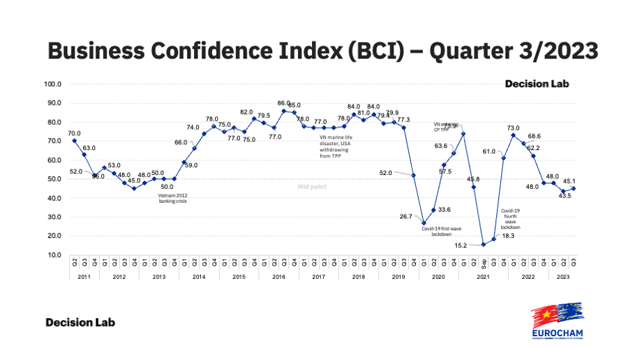The European Chamber of Commerce Vietnam (EuroCham)’s quarterly Business Confidence Index (BCI) regained its upwards trajectory in the third quarter of 2023, offering a glimmer of hope for Vietnam’s business environment after a turbulent year. Conducted by Decision Lab, the BCI has provided a periodic pulse check on Vietnam’s economy since 2011.