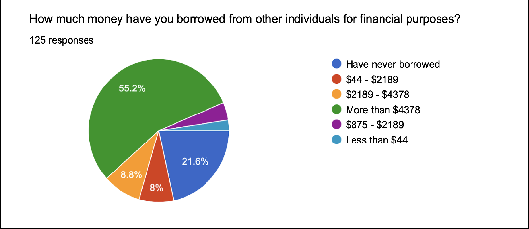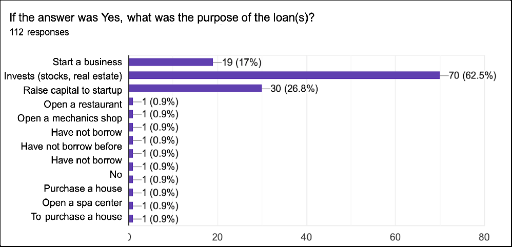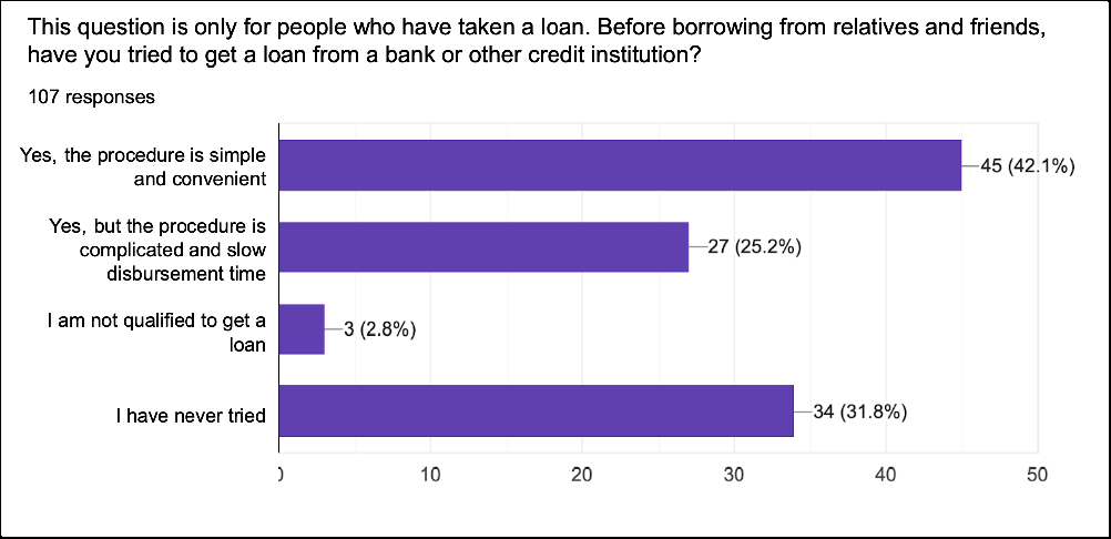 My Google Forms survey asked various questions that assessed micro-lending history, size, performance, and effectiveness with business purposes. The convenience sampling survey was sent to 125 Vietnamese in Ho Chi Minh City ranging from 17 to 55 years of age with various jobs. These results must be interpreted with caution, and two limitations should be borne in mind: sampling bias and insufficient sample size. I had limited ability to gain access to the geographic scope of participants, here being other provinces and the countryside. In addition to that, my sample is not considered representative of the Vietnamese population, with a diversity of economic conditions.