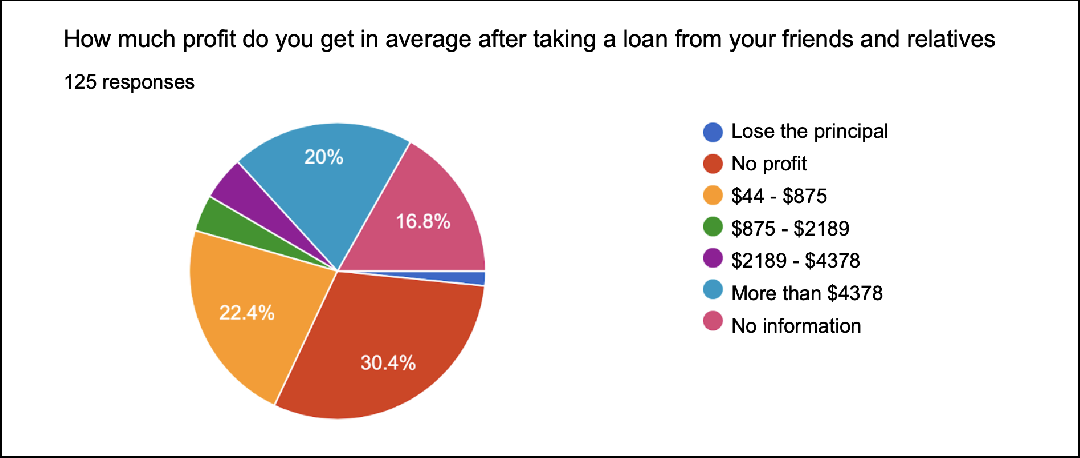 As can be seen from the charts, the amount of loans is not small. In fact, 68 people (55.2 per cent) borrowed more than $4,400. The median profit was $1,378. GDP growth in this sector is 31.32 per cent. Meanwhile, the highest official GDP growth in Vietnam’s history is 8.4 per cent, according to “Financial Turbulences in Vietnam’s Emerging Economy”. “Informal Microfinance” grew almost four-fold more than all other sectors combined.
