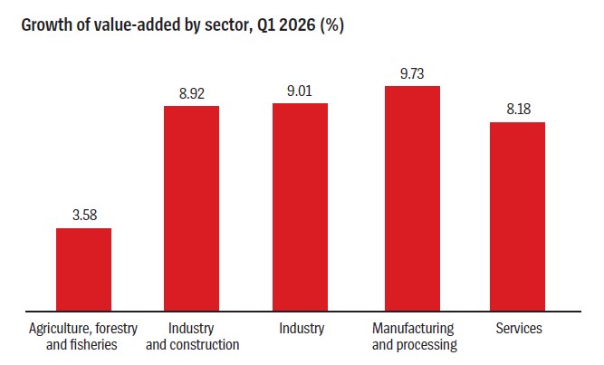 Final consumption grew faster than GDP, at an estimated 8.45 per cent. The share of final consumption in GDP increased compared with the first quarter of last year, making it an important contributor to overall growth. Stronger domestic demand played a key role in supporting this expansion.