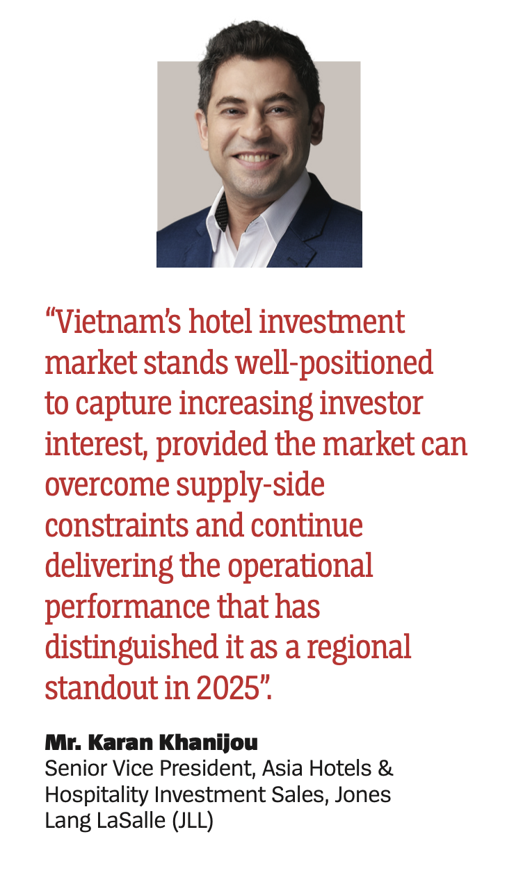 Mr. Karan Khanijou, Senior Vice President, Asia Hotels & Hospitality Investment Sales, at JLL, underscored just how dramatic the turnaround has been. “Vietnam’s hotel market has demonstrated remarkable resilience and recovery momentum throughout 2025, positioning itself as one of Asia’s standout performers,” he told Vietnam Economic Times / VnEconomy.