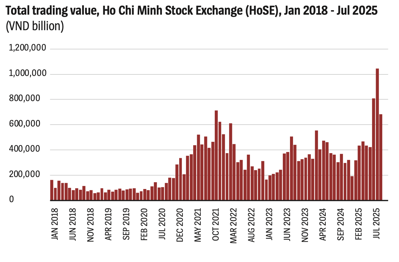 At the same time, trading volumes have reached unprecedented levels. During the first quarter of 2022, total daily transactions across its three exchanges surprised the market by hitting VND40-42 trillion ($1.54-$1.62 billion). In July and August 2025, meanwhile, sessions exceeding VND80 trillion ($3.08 billion) were recorded. The Ho Chi Minh Stock Exchange (HoSE) set a record in August, with total trading value surpassing VND1,000 trillion ($38.46 billion).